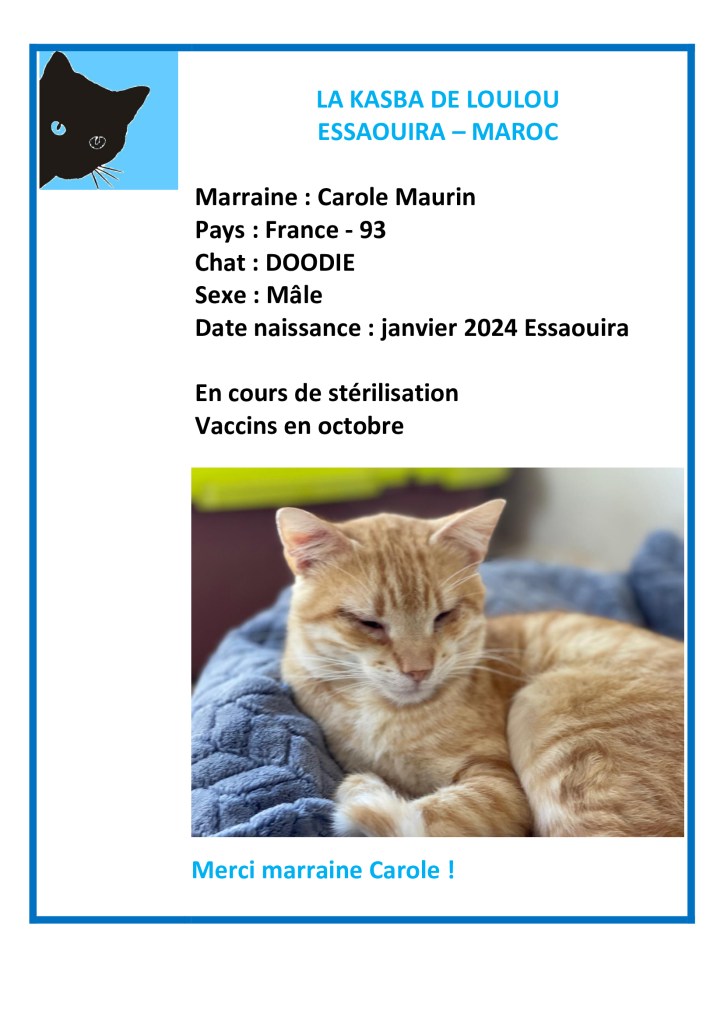 Merci à Carole Maurin d’avoir choisi de parrainer Doodie et ainsi financer sa vaccination et sa stérilisation !