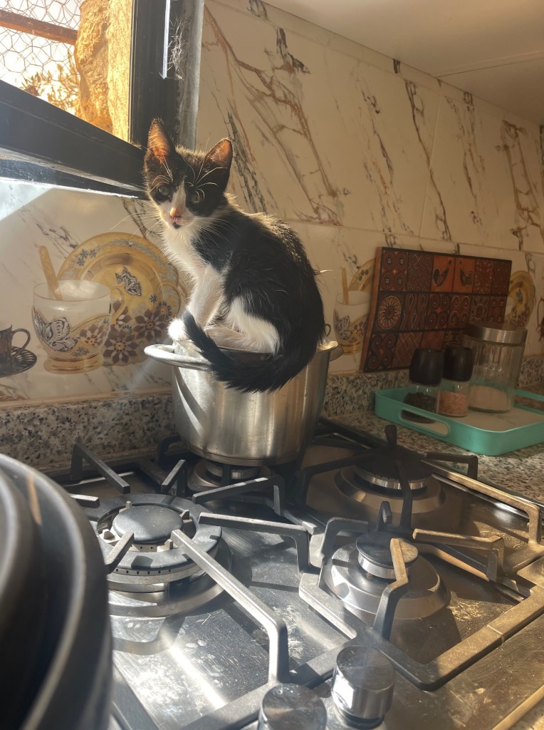 Domino surveille de près la casserole de riz pour Liza, la mamie chienne !