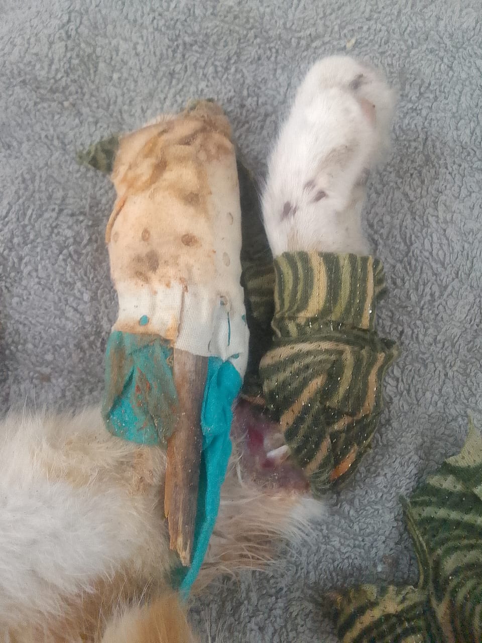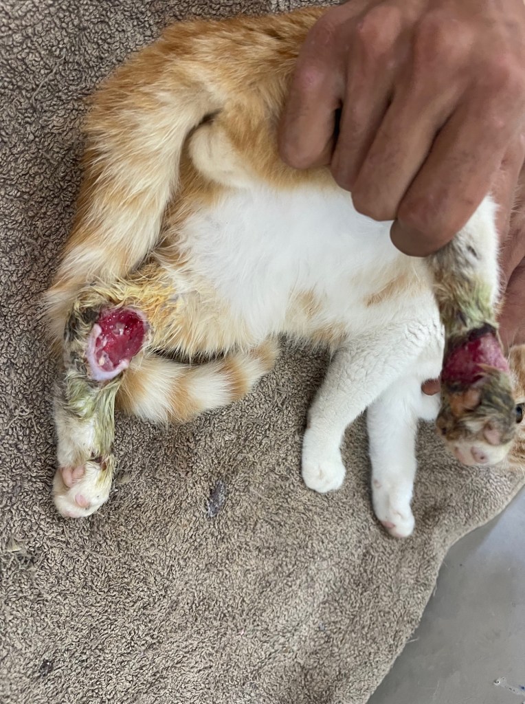 En photo : à son arrivée et maintenant. Les gens qui récupèrent des animaux blessés pensent bien faire en mettant des pansements… des atèles… J’ai un jour retrouvé une pauvre chatte bouffée par la pourriture après que les gens aient mis des sacs en plastique en guise de pansement. La pauvre est morte dans mes bras…