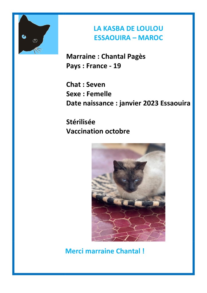 Merci à Chanchan Pagès d’avoir choisi de parrainer Seven et ainsi financer sa vaccination annuelle 2025 et un MiamMiam !