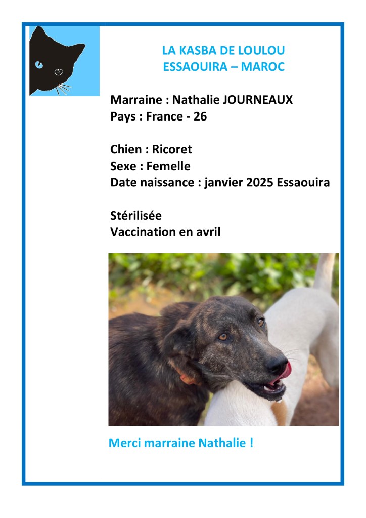 Merci à Nath Jrx d’avoir choisi de parrainer Owen et Ricoret et ainsi financer leur vaccination annuelle 2025 et 2026.