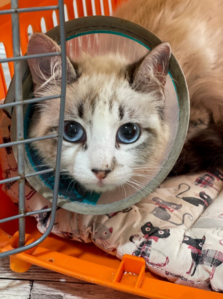 Les derniers fils ont été enlevés. Tout va bien ! Elle garde la collerette encore 2 jours.