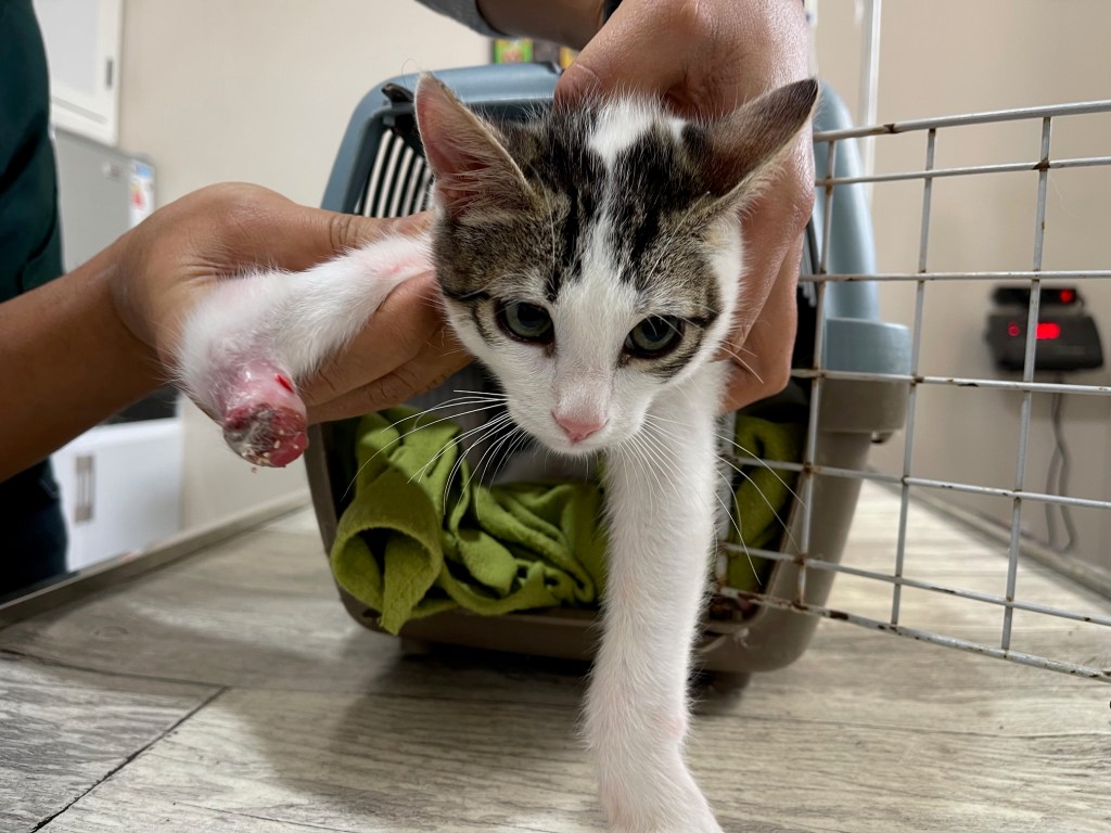 On m’a contacté pour ce jeune chat avec une grosse infection à la patte.