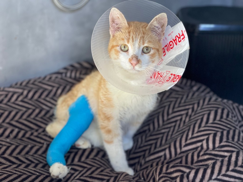 Caruso est un chat adorable. Il m’a appelé à l’aide. Après une première visite : 3 fractures : une au bassin qui va se remettre toute seule, une sur la colonne vertébrale qui a rendu sa queue morte et une sur la patte avant.