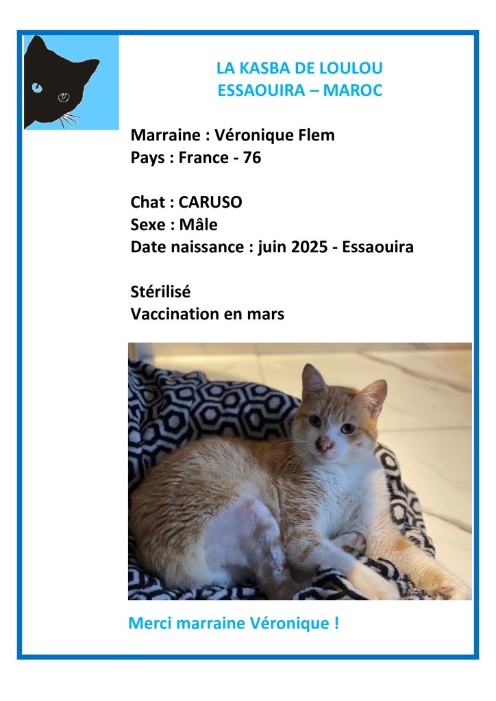 Merci à Véronique Flem (Instagram) d’avoir choisi de parrainer Caruso et ainsi financer sa vaccination annuelle 2026 !