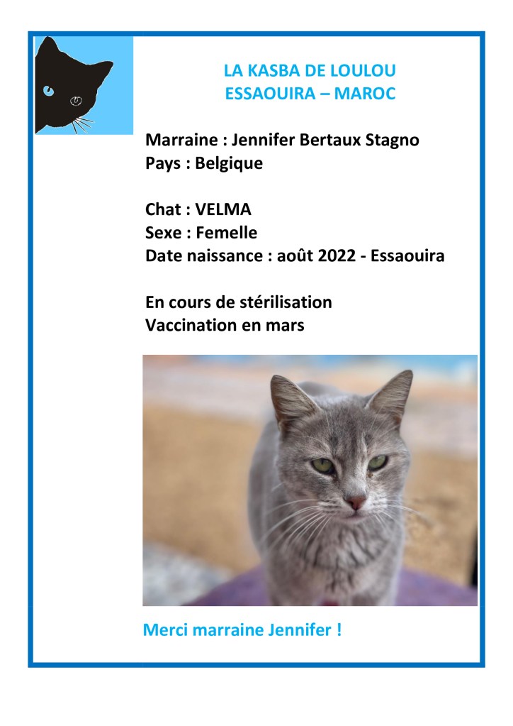 Merci à Jennifer Btx d’avoir choisi de parrainer Velma et ainsi financer sa vaccination annuelle 2026 !