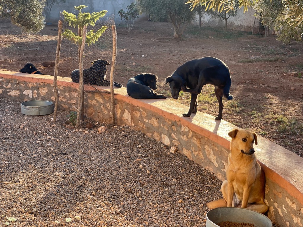 Photo de famille : Linda, maman la chienne beige et au fond Owen, le papa noir et les 3 filles noires : Amy, Beth et Meg. Il manque Louis, la fille beige !