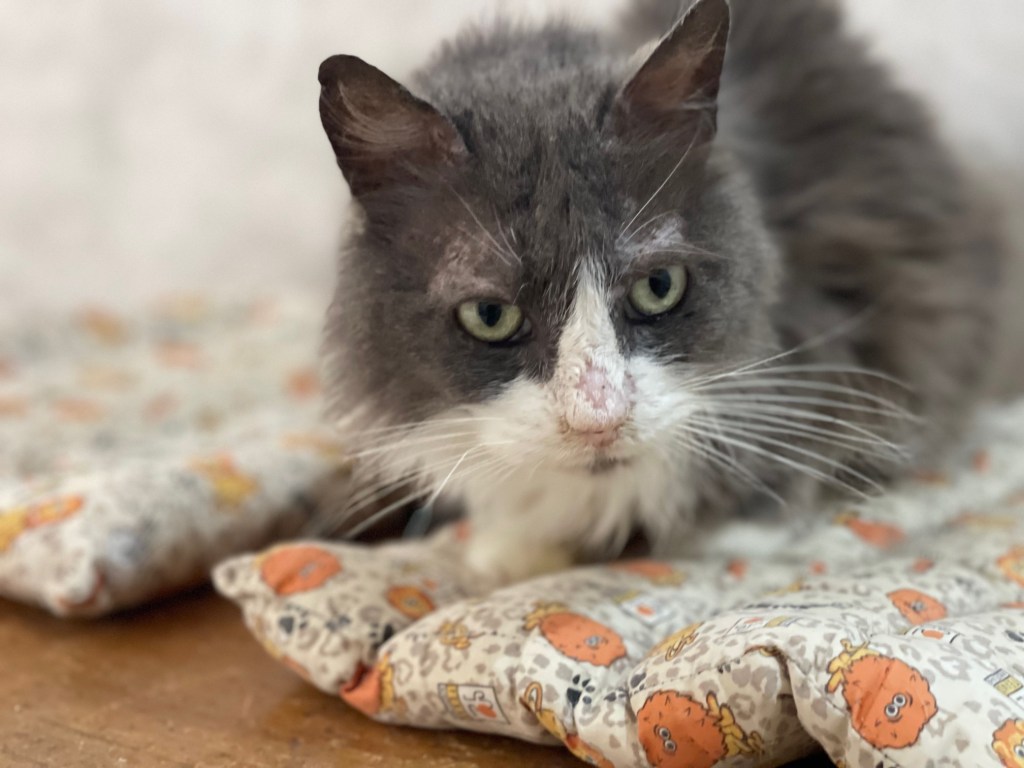 Grisouille, le chat de mon amie Françoise décédée n’est pas au mieux de sa forme. Il a beaucoup maigri…
