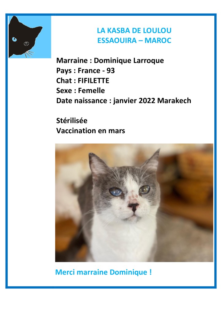 Merci à Dominique d’avoir choisi de parrainer Fifilette et ainsi financer sa vaccination annuelle 2026 !
