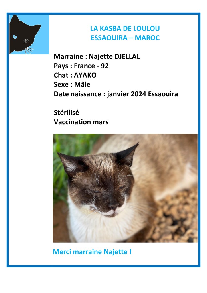 Merci à Naj Dje d’avoir choisi de parrainer Ayako et ainsi financer sa vaccination annuelle 2026 et des MiamMiam !