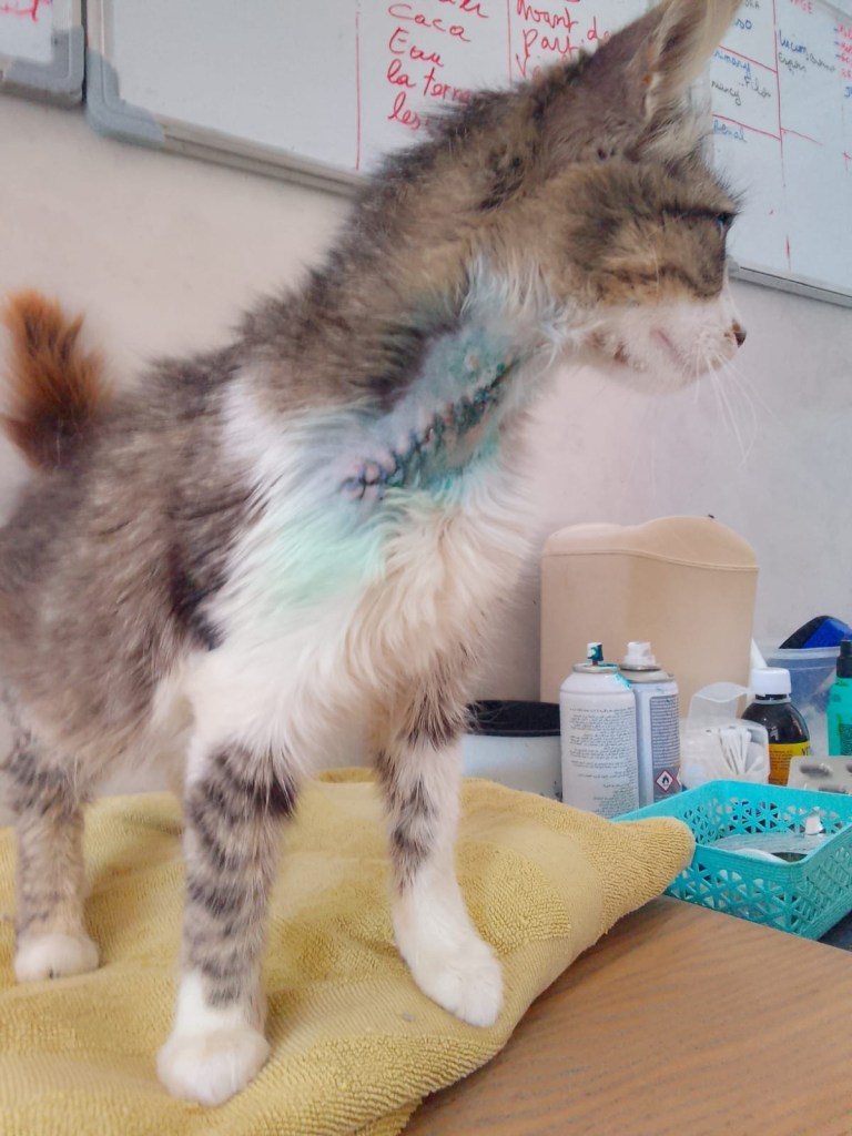 Hier, la petite Betty est arrivée au refuge. Elle a été soignée par Mostafa. Il parait que Betty a été attaquée par un goéland et qu’ensuite la plaie s’est infectée…. Caroline et Anna l’ont pris en charge.