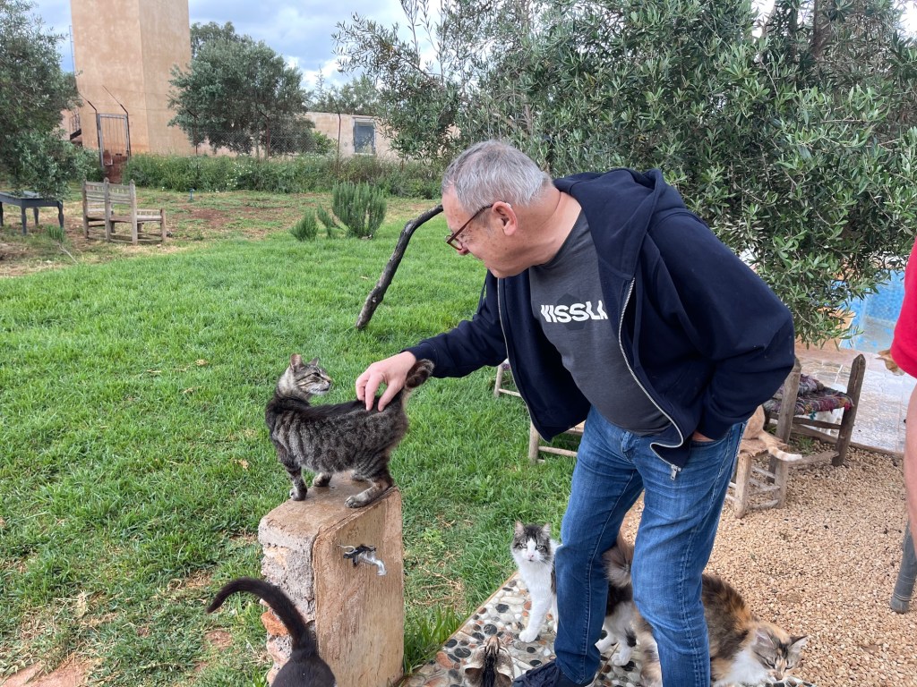 Dominique Legris, le parrain de Sheba, accompagné de ses amis de France : Yves, Françoise et Christian sont venus rendre visite aux chats et chiens de La kasba de Loulou.