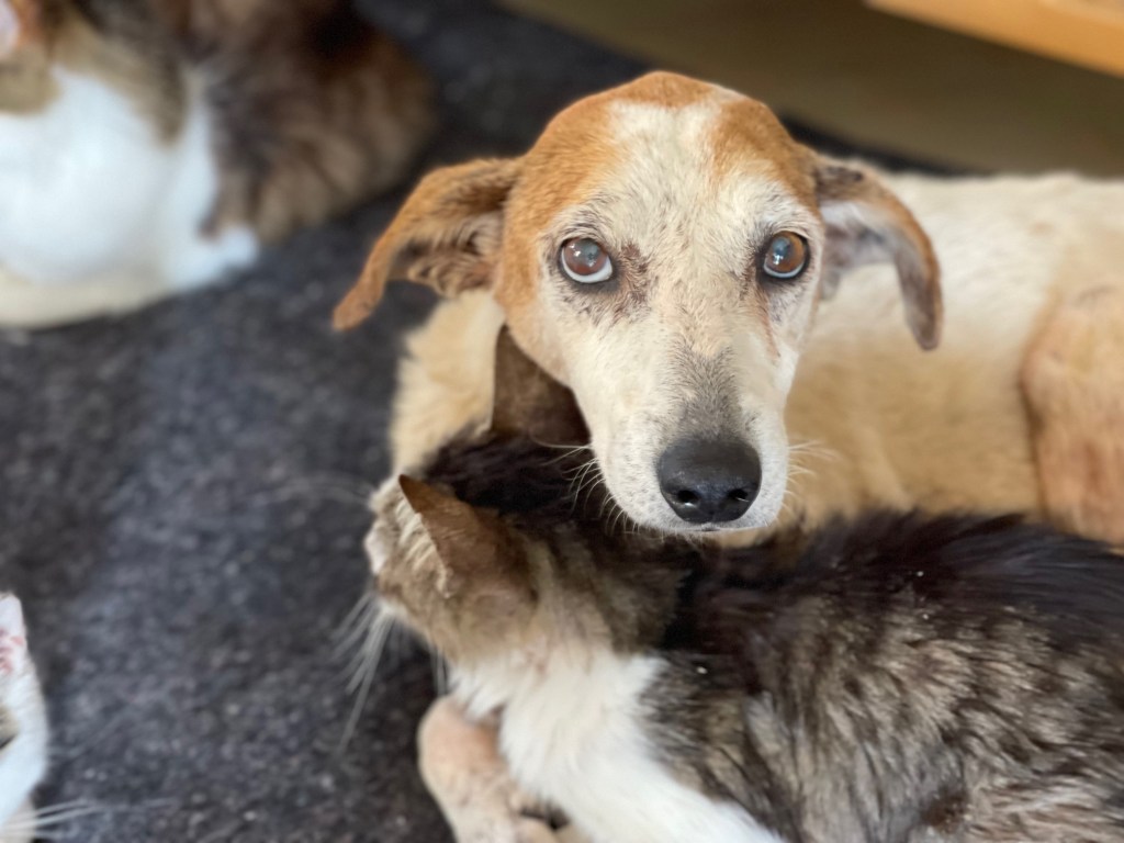 En photo : Jeanie, sauvée de la rue par Caroline Millar et Anna Jayne. J’ai rencontré Jeanie chez le vétérinaire Mostafa Cabinet Vétérinaire Essaouira. J’ai fondu en larmes quand je l’ai vue… C’était tellement un choc de voir le sosie de Liza… C’était une évidence qu’elle vienne à la maison… La même douceur, la même vieillesse, les mêmes douleurs…