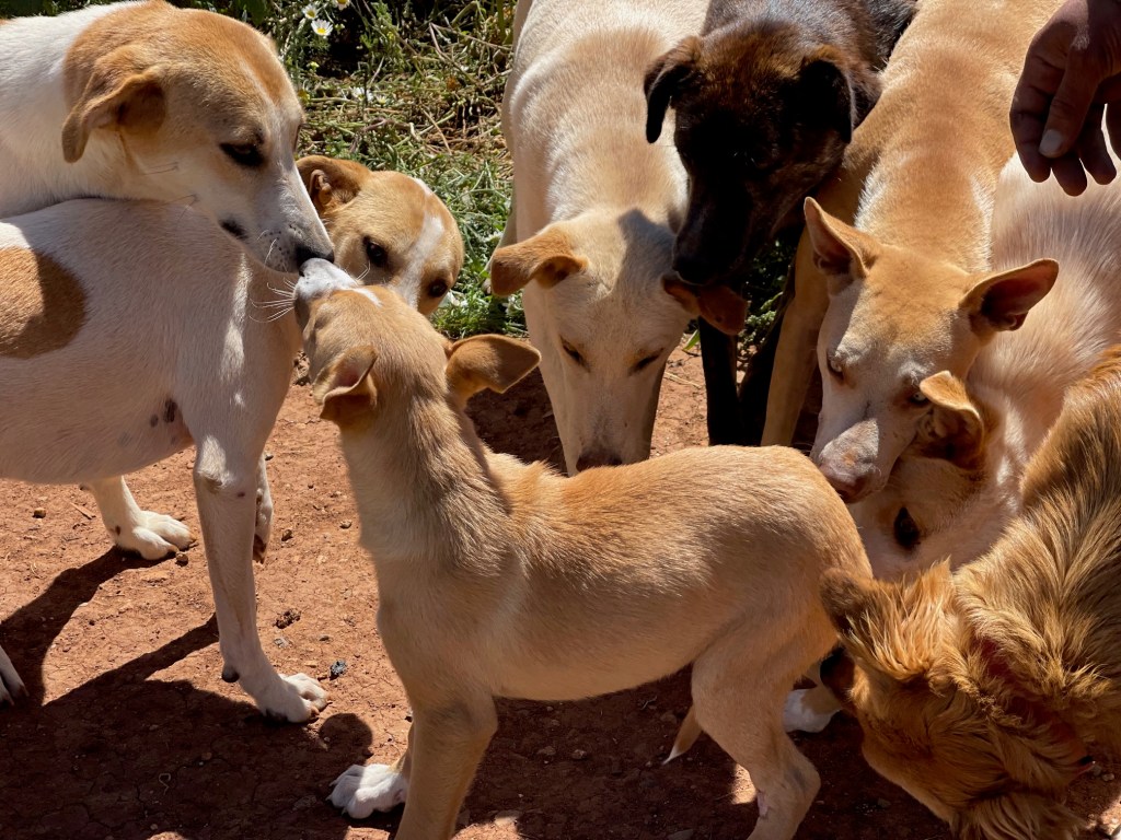 Nous distribuons également à notre nouveau village. Je ne peux plus prendre de chiens à la maison, mais je fais en sorte que tous les chiens mangent au moins une fois par jour. Nous surveillons également si par exemple ils sont atteint de la gale et je les soigne.