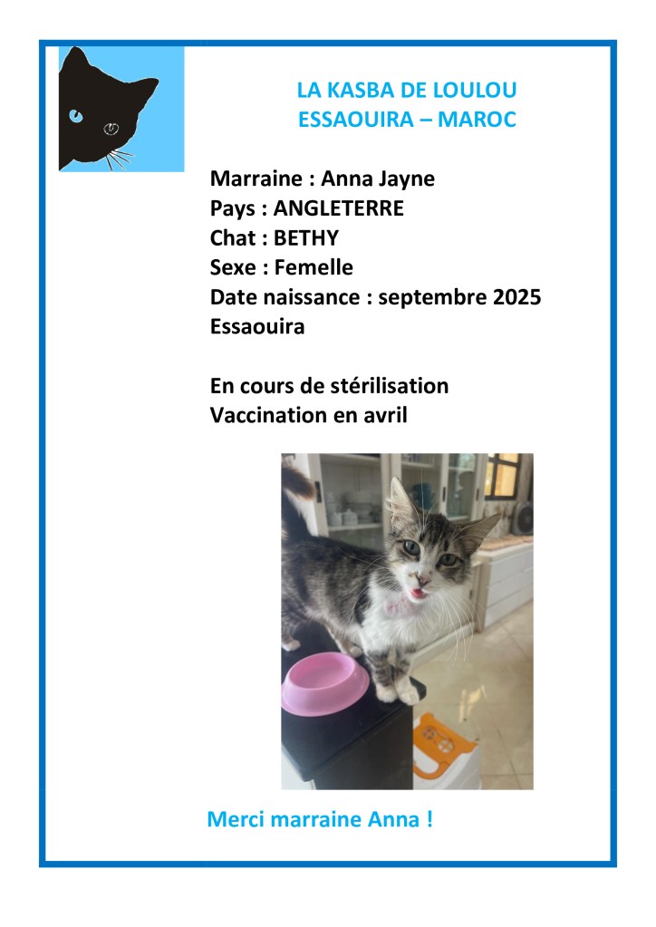 Merci à Anna Jayne d’avoir choisi de parrainer Bethy et ainsi financer sa vaccination annuelle 2026 et des MiamMiam !