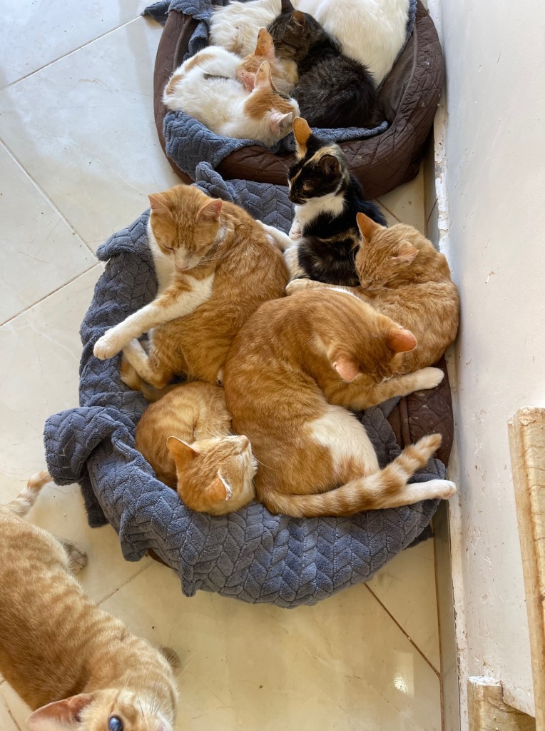 Il fait très froid la nuit en ce moment… pas de chauffage dans les maisons au Maroc… donc les chats se blottissent entre eux… et mangent beaucoup plus !