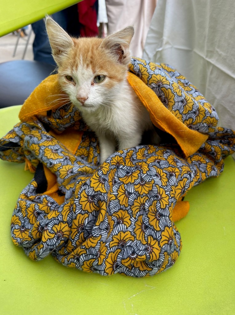 J’aurai bien aimé amené au refuge ce jeune chat, très tranquille qui est resté au marché tout le temps…