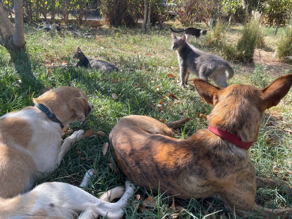 Les chiens et chats venaient chercher leurs petits câlins ou tout simplement restaient couchés à côté de moi… à l’ombre des arbres du jardin des chiens…