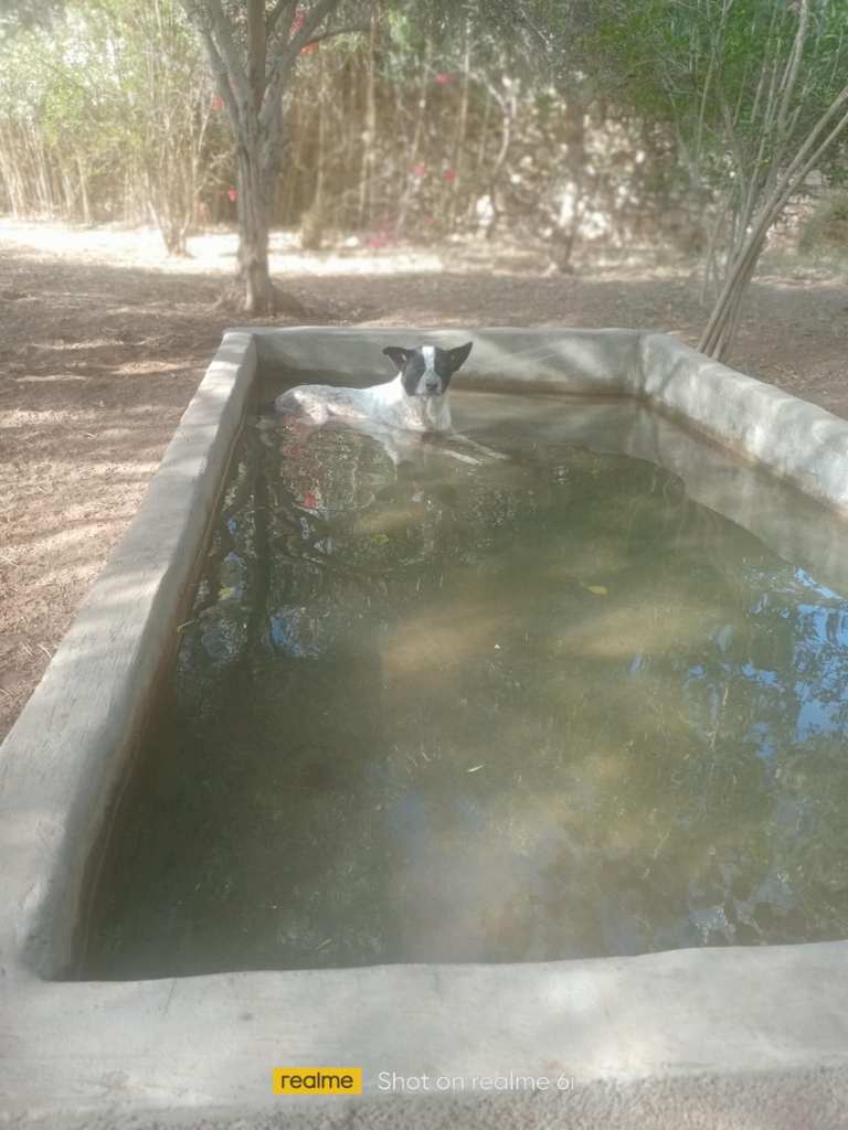 Geluk adore la piscine confectionnée l’été dernier pour les chiens ! Geluk en pleine séance de thalassothérapie ! Nous avons pu enfin changer l’eau avec la nouvelle pompe du puits . Tellement contente d’avoir Geluk à la maison, chien des rues avec séquelles de maladie de carré…