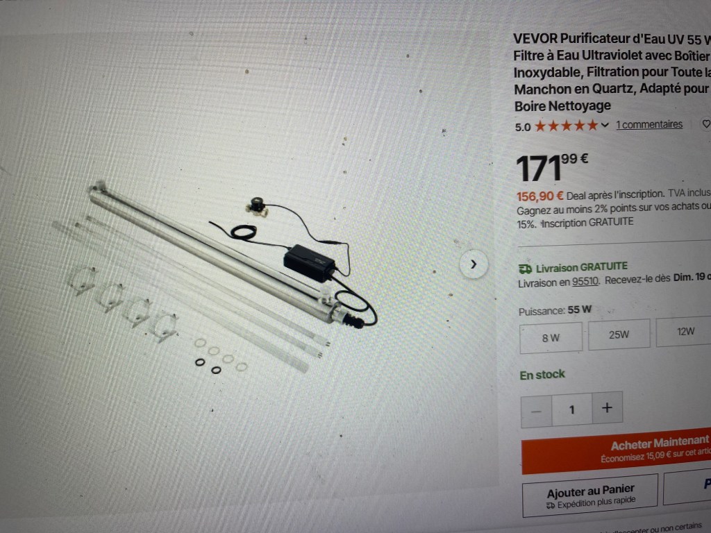 J’ai donc pris la décision d’acheter un purificateur d’eau UV qui va éliminer les bactéries de l’eau du puit.