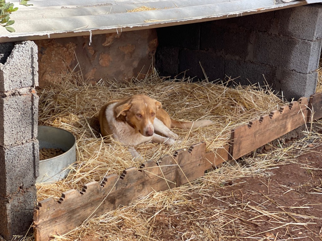 Changement de la paille mouillée dans les cabanes des chiens par Ahmed, le jardinier
