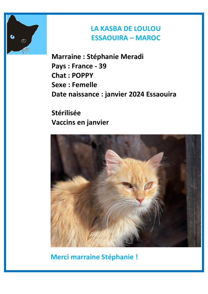 Merci à Stéphanie Meradi d’avoir choisi de parrainer Poppy et ainsi financer sa vaccination 2025 et 2026 !